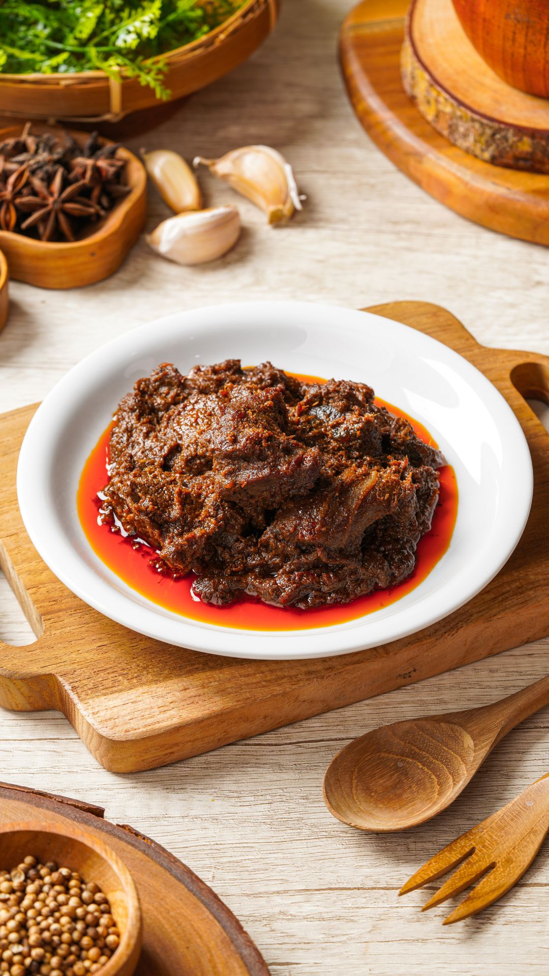 Spiced fried rice topped with tender beef rendang